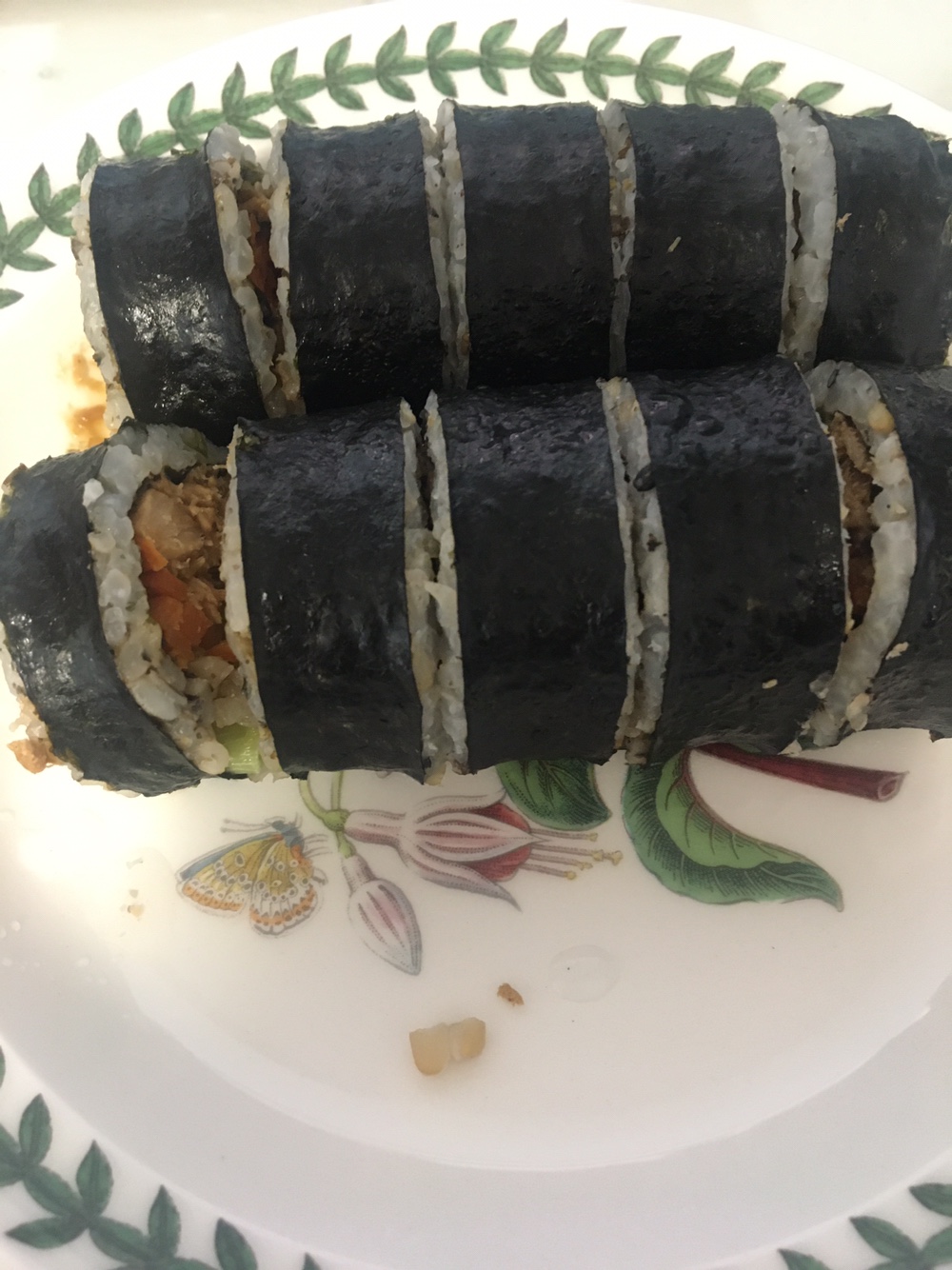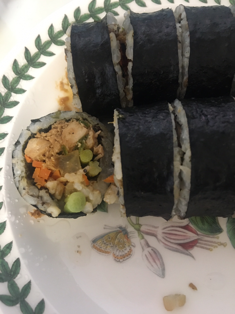 내용물은 닭가슴살, 떙초, 단무지, 당근, 그린빈이 들어가 있어요