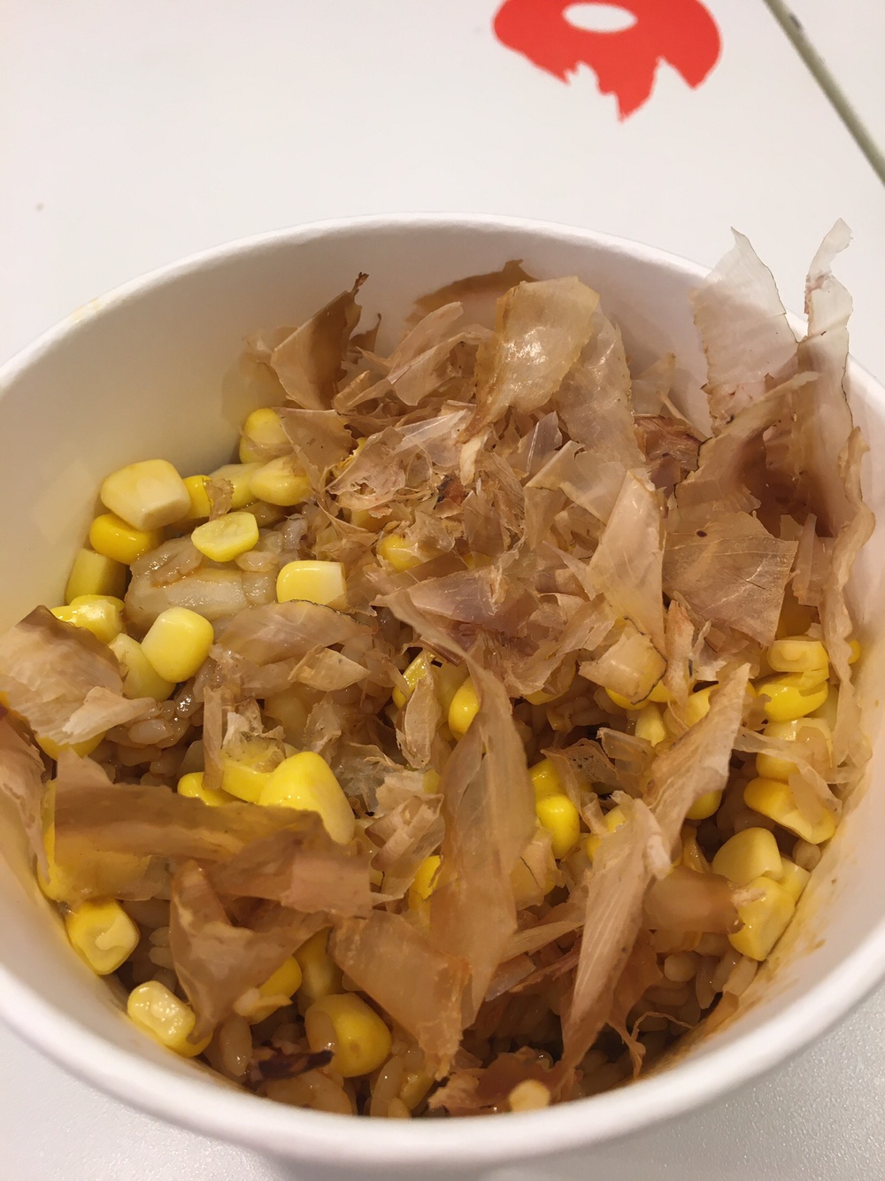 해물소스, 밥, 옥수수, 오징어, 가다랑어포가 잘 조화된 맛이에요
