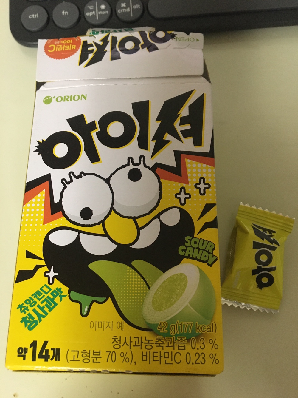사과맛 카라멜 안에 신맛나는 가루가 들어있어요