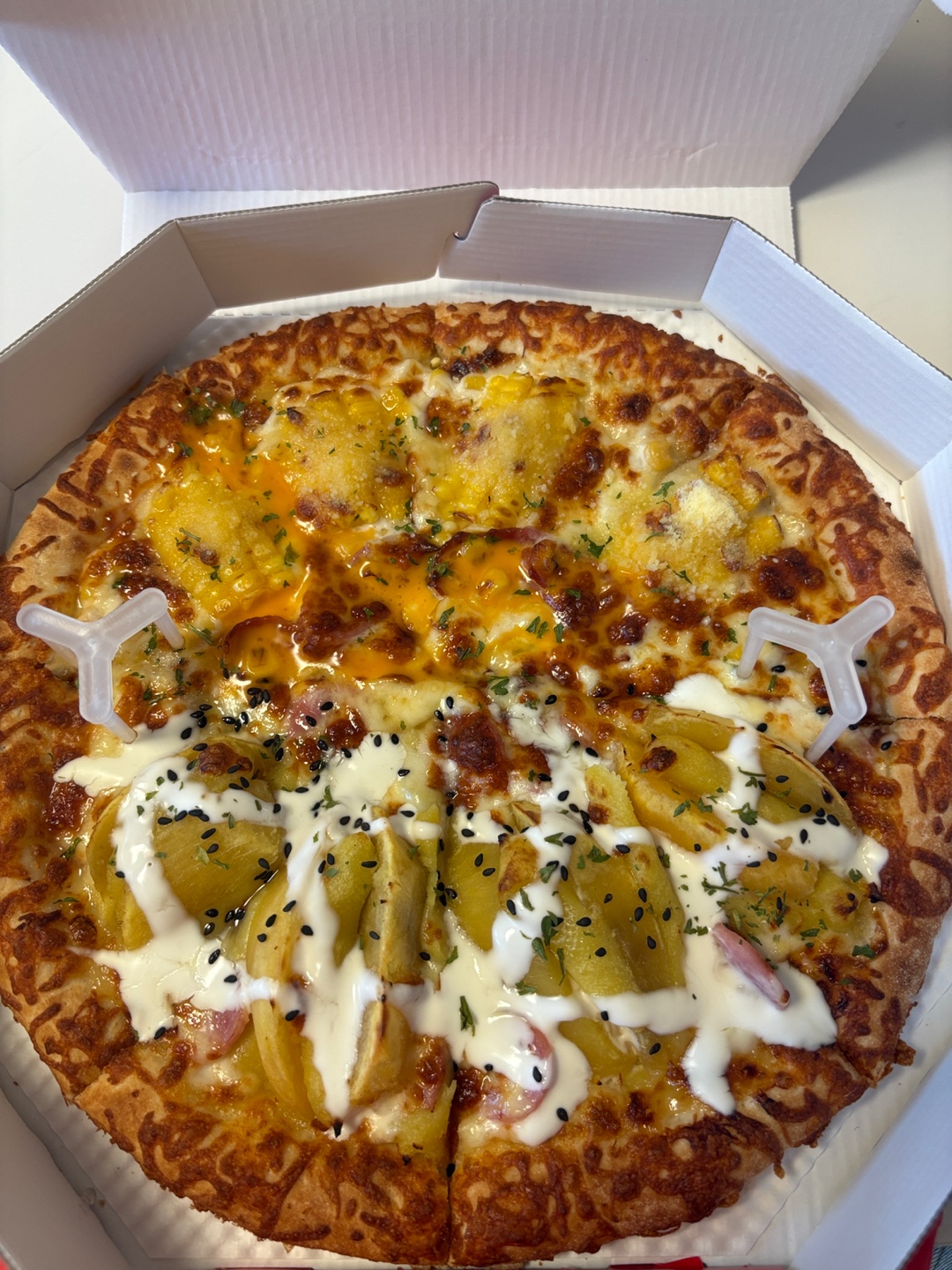 달달구리 꿀통고구마 피자는 고구마 슬라이스, 고구마 무스, 소시지 조각, 흰색 소스, 모짜렐라 치즈가 토핑되어 있어요
