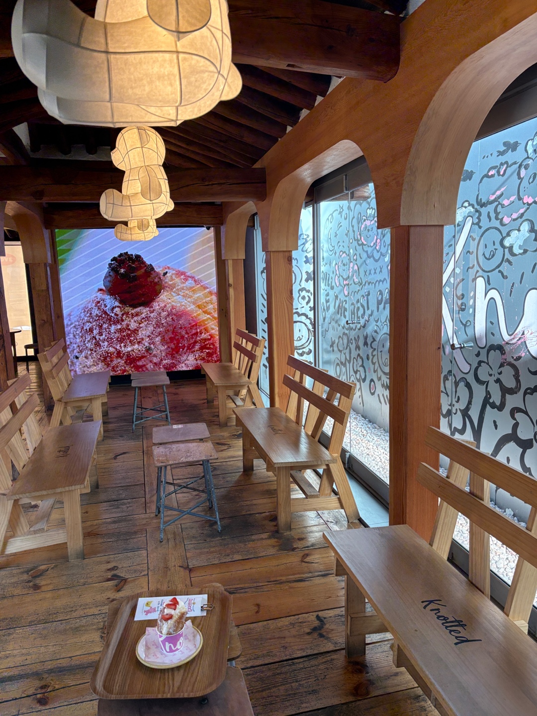 원목 마루에 원목 탁자와 의자들이 놓여있고 천장에는 한지로 만들어진 곰돌이 모양 조명이 달려있었어요