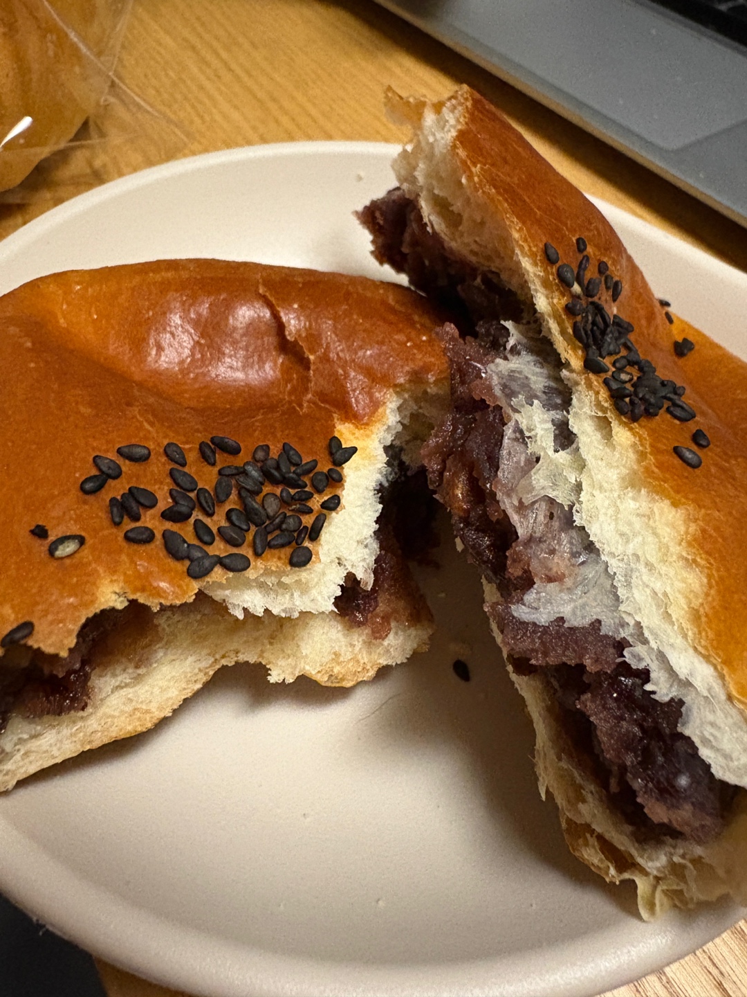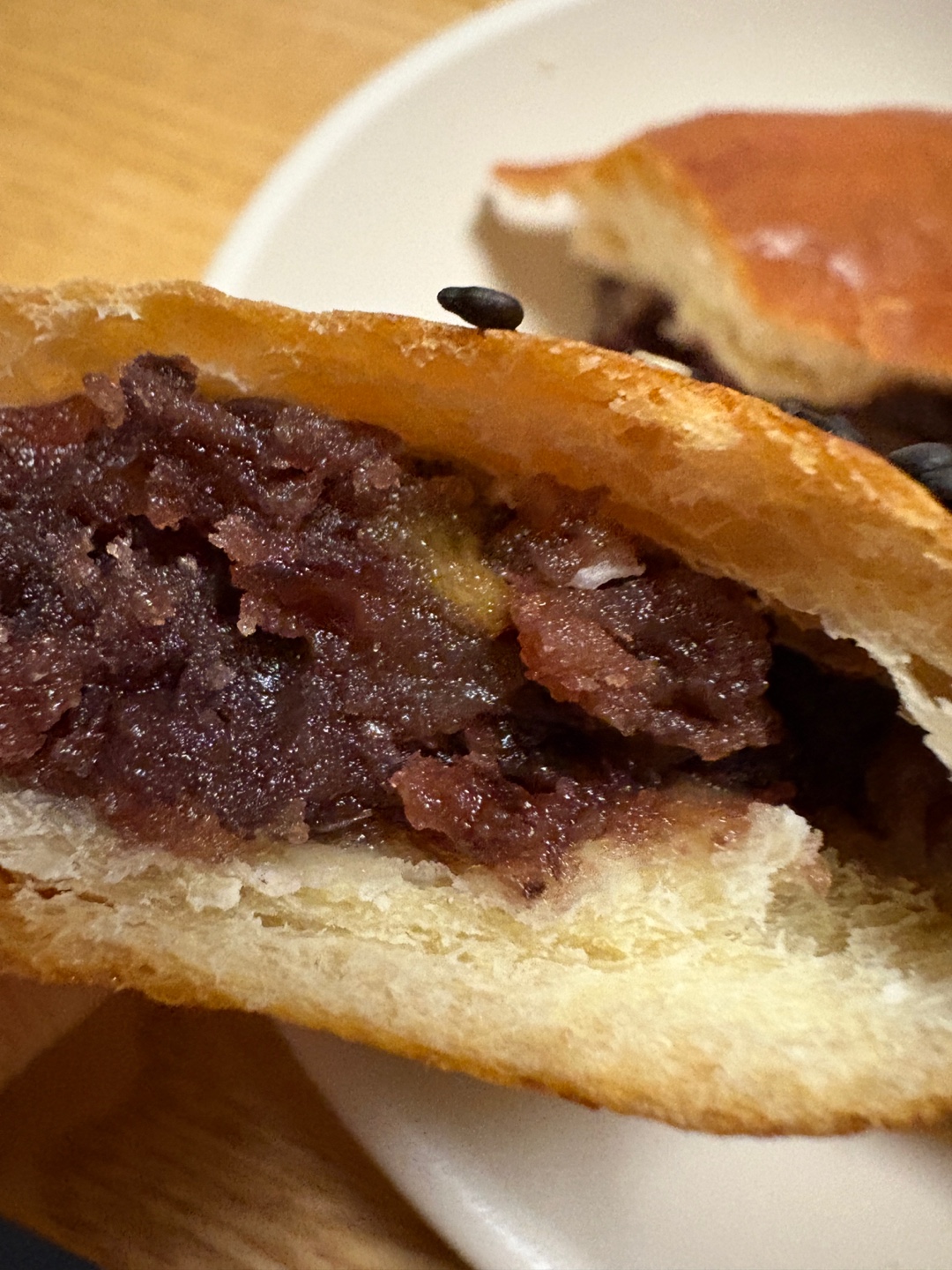 단팥빵은 팥소가 가득 들어있고 팥소에 호두 조각들이 들어있어요