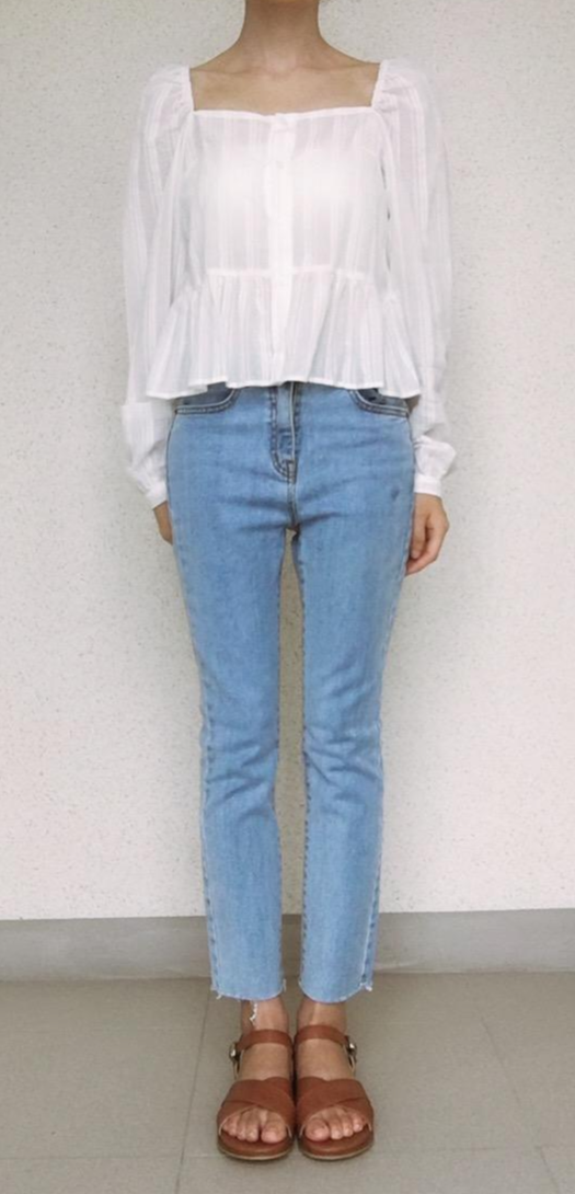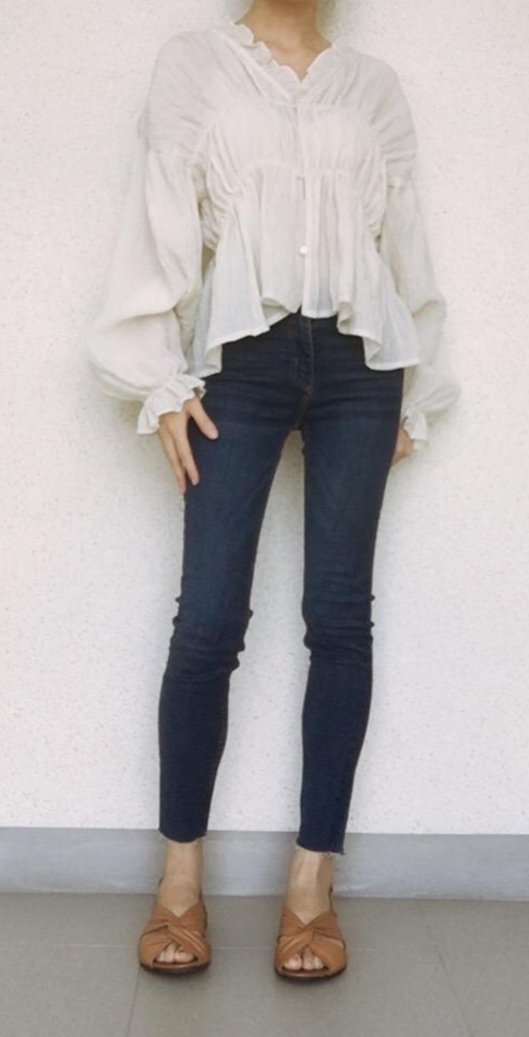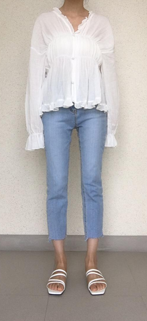 에이블리에서 셔링 디테일이 예쁜 여성스러운 블라우스를 구매했어요. 브이넥, 목과 소매의 프릴 디테일, 가슴 쪽에 잡힌 셔링 디테일, 밑단 플레어 디테일, 퍼프소매 디자인, 내려가 있는 어깨선 디자인이 여성스럽고 여리여리하고 귀여운 분위기를 뿜뿜하게 해주는 블라우스예요. 색상은 누런 끼가 약간 있는 연한 베이지 색상이에요. 색상이 부드럽고 따뜻한 톤이라서 인상도 한층 부드러워 보이게 해 줘요. 색상은 베이지색 외에 블랙 색상도 있어요. 기장은 159cm 키에는 골반에 걸쳐지는 길이고 손목 쪽 프릴에 고무줄이 짱짱해서 소매의 퍼프 디자인을 잘 살려줘요. 품이 낙낙하고 여유로운 핏이어서 착용하면 하늘하늘하고 여리여리 해 보여요. 원단 자체에 주름이 있는 거즈 면같은 원단이에요. 두께는 얇아서 여성스러운 블라우..