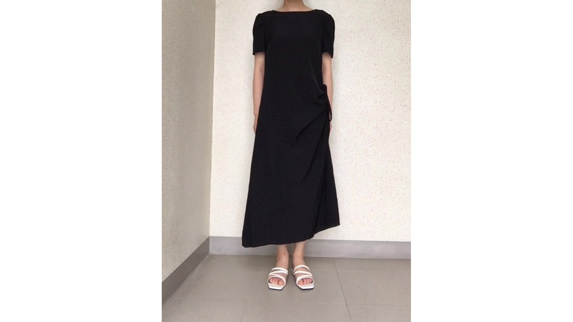 제품 정보유에르 yuere # VOLUME DRESS (BLACK) 유에르의 블랙 반팔 롱 원피스에요.깔끔하고 클래식하고 베이직한 디자인에 한쪽 사이드에 스트랩을 조여서 자연스러운 주름 디테일을 연출할 수 있어요.스트랩을 리본으로 묶거나 자연스럽게 늘어뜨리는 모양이 예뻐요.소매에는 셔링 디테일이 들어가 있어요.전체적으로 잔잔한 플라워 패턴이 있어서 여성스러워요.원단은 부드럽고 매끄럽고 촤르륵한 재질이고 여름에 입기 좋은 얇기에요.기장은 159키에 발목이 보이는 정도에요. 핏은 a라인으로 떨어지는데 사이드 스트랩을 조이면 자연스럽게 사선으로 밑단이 연출이 돼요.기본 블랙 원피스로 소장하기 좋아요.일상에서 베이직하게 입기 좋고 결혼식같은 자리에서도 입기 좋을 우아하고 여성스러운 무드의 블랙 원피스에요. 유에..